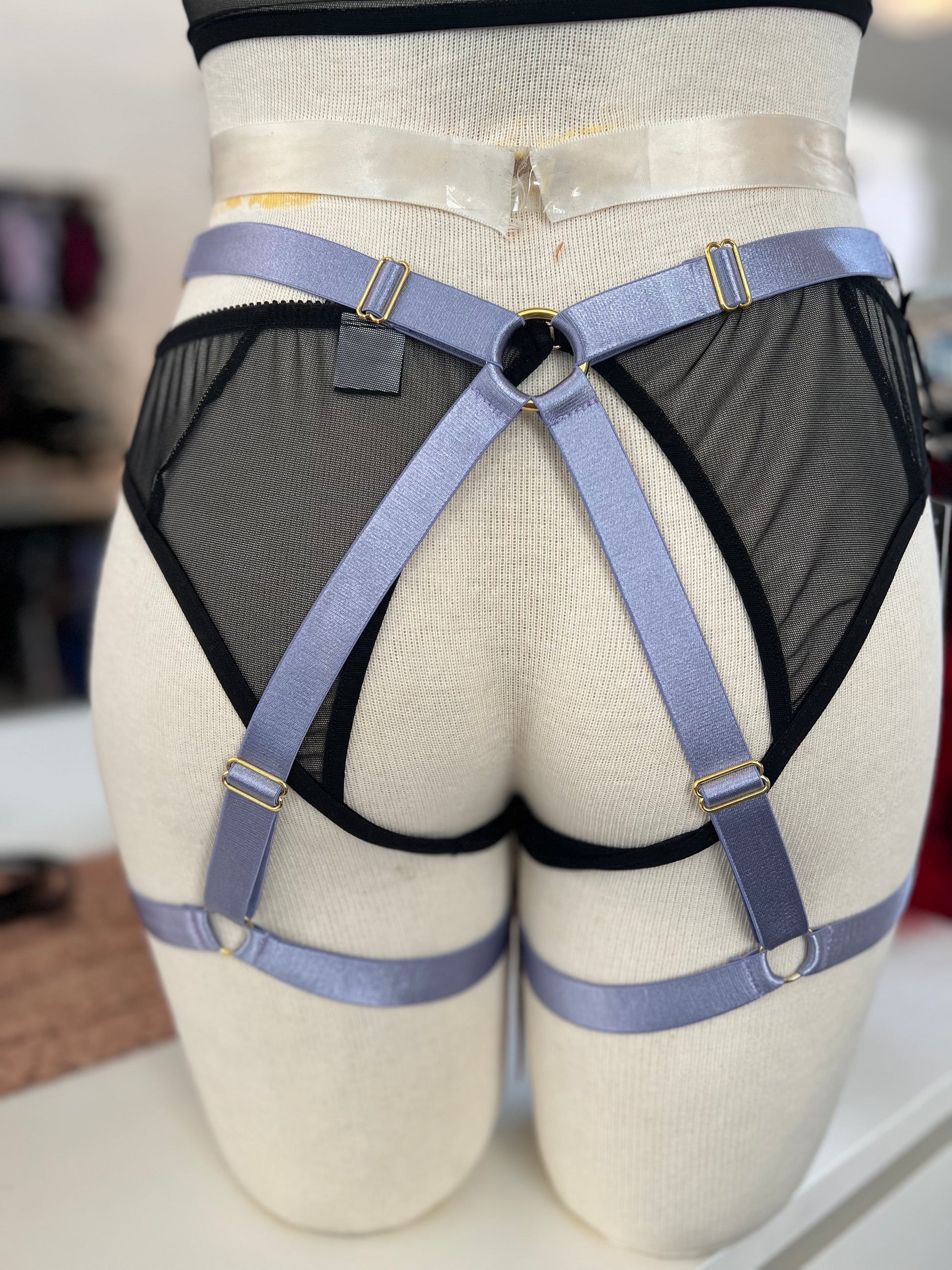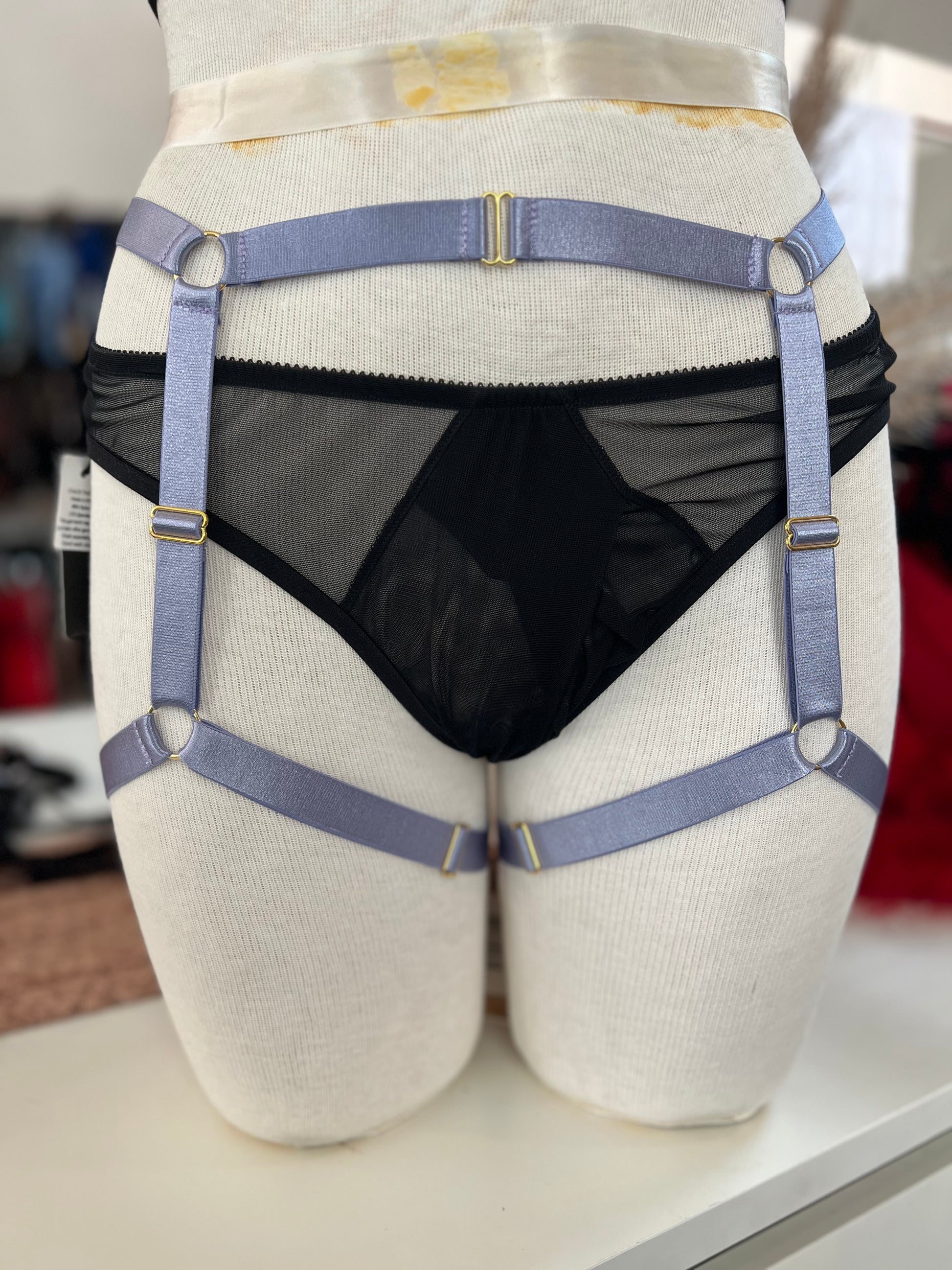 Fully adjustable garter shorts with X-back detail. Wide, soft elastic straps with a satin shine paired with gold or silver metal hardware. Each strap is adjustable to fit and flatter every body type.
