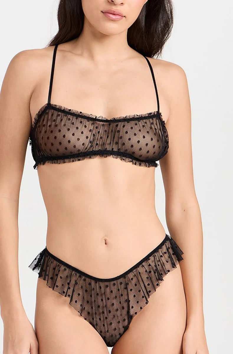 Discover the decadent Coucou Lola Joey Bralette. It’s sultry and sheer, yet elegant and feminine with its stunning ruching, ruffled trim, and all-over Swiss dot pattern. It features a pull-on design with delicate adjustable straps for increased comfort. Slip into this romantic bralette and pair it with your favorite Coucou Lola bottoms for a timeless and alluring look.