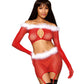Seamless fishnet and feather trim Santa two piece garter lingerie costume set including off-the-shoulder bralette with keyhole detail and attached long-sleeve gloves with fingers. Matching garter skirt with adjustable garters. Thong and thigh-high stockings not included.
