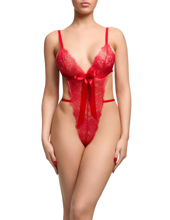 Fantacist is playful and enticing. The Fantacist Bodysuit is a stretch lurex lace bodysuit with g-string back and ribbon tie trims. Unlace the ribbon ties and tease!