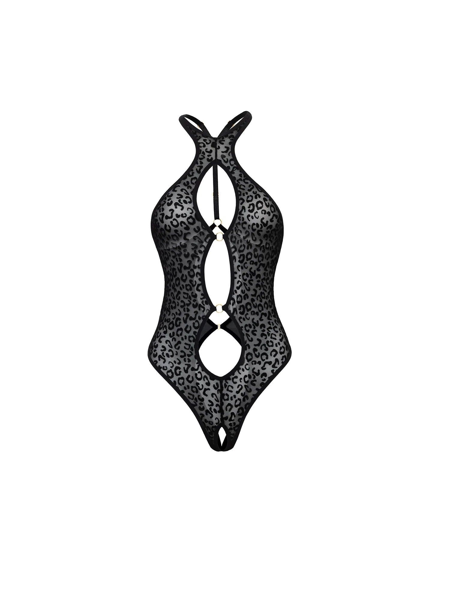 - Soft cup teddy with front keyhole cut-outs and a leopard print