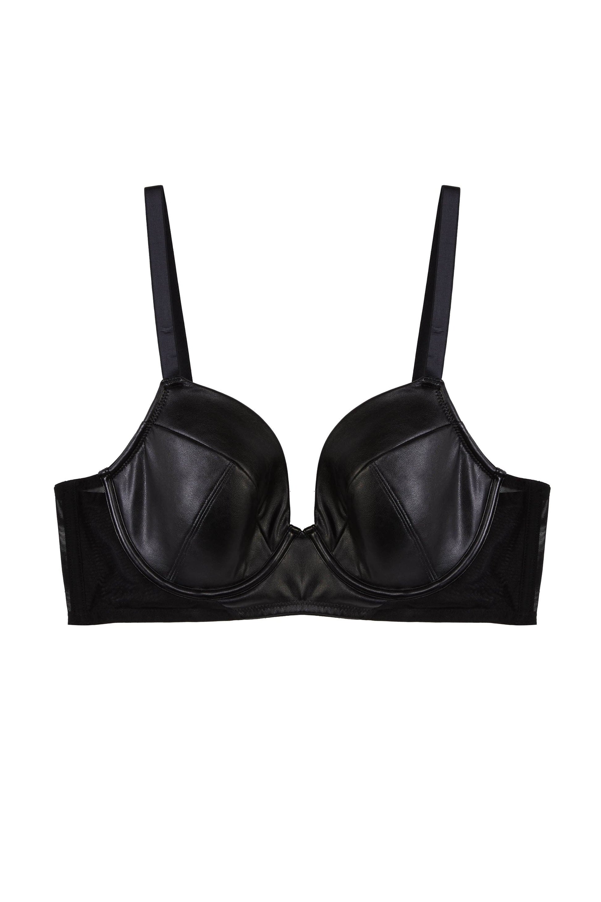 Take a walk on the dark side and dip your toe into bondage lingerie with the erotic 'Iris Black Leatherette Padded Plunge Bra'. This incredibly sexy black bra features underwired, lightly moulded foam plunge cups to guarantee those ladies have all the lift they need! Black leatherette fabric constructs the bridge and cups, leading to a supportive black mesh hook and eye fastening band.