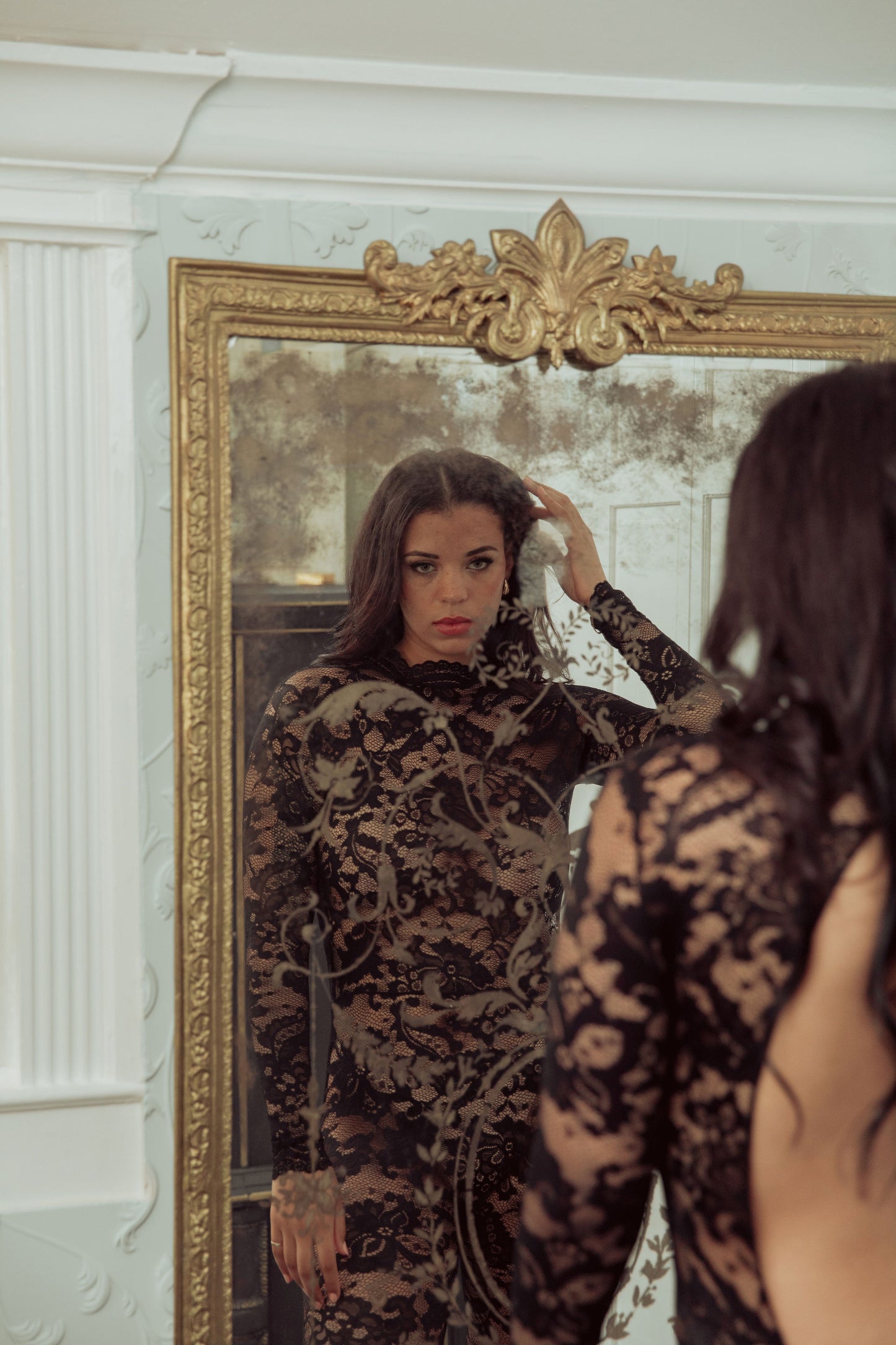 Catsuit made with super soft stretch floral lace. Open back , high neck with clasp at back neck. Meowww!