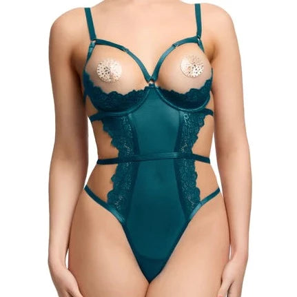 Inspired by Dita's iconic Madame X collection this new version is especially erotic and fetishistic. The Madame XXX Bodysuit features lace quarter cups with strap details, a G-string back and stretch lace through the front. *Pasties not included*