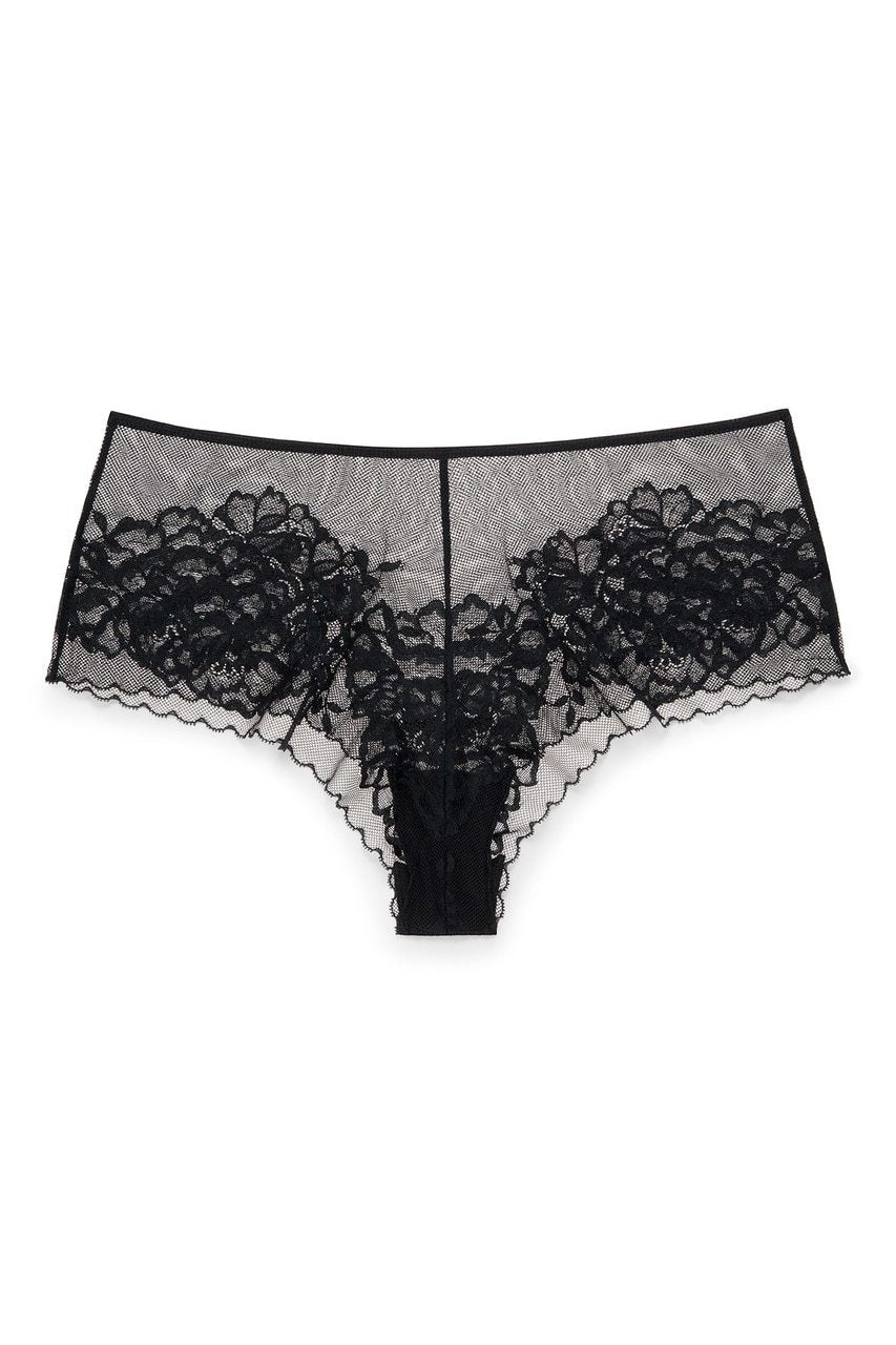 - Scalloped edge lace with no elastic at legs eliminates dig-ins